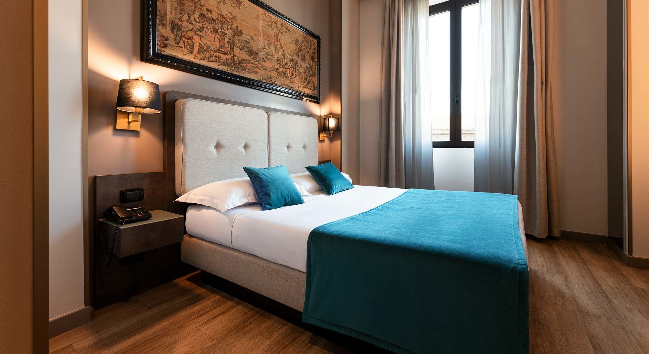Doppelzimmer mit Ehebett, stilgerecht eingerichtet, bietet es eine elegante und erholsame Atmosphaere.